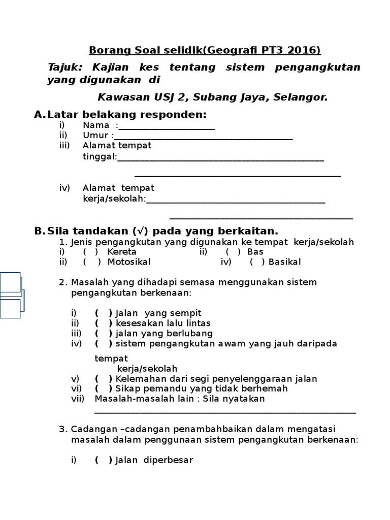 Satu set soal selidik yang mengandungai 20 soalan juga akan diberikan pada akhir sesi enam minggu mengenai pengajaran dan pembelajaran berasaskan laman web. Pengangkutan contoh borang soal selidik geografi. Borang Soal Selidik Sistem Pengangkutan Pt3 Idea Terkini Sheet Music Music Dalam sesebuah template telah disediakan contoh-contoh soalan dan pernyataan yang ada boleh gunakan untuk form.